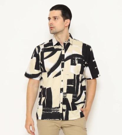 Kemeja ini memiliki motif abstrak dengan dominasi warna cream dan hitam. Cocok dipadukan dengan celana jeans atau chino warna gelap. Desainnya yang berani namun tetap elegan membuat kamu bisa tampil percaya diri di berbagai acara, baik formal maupun santai.
